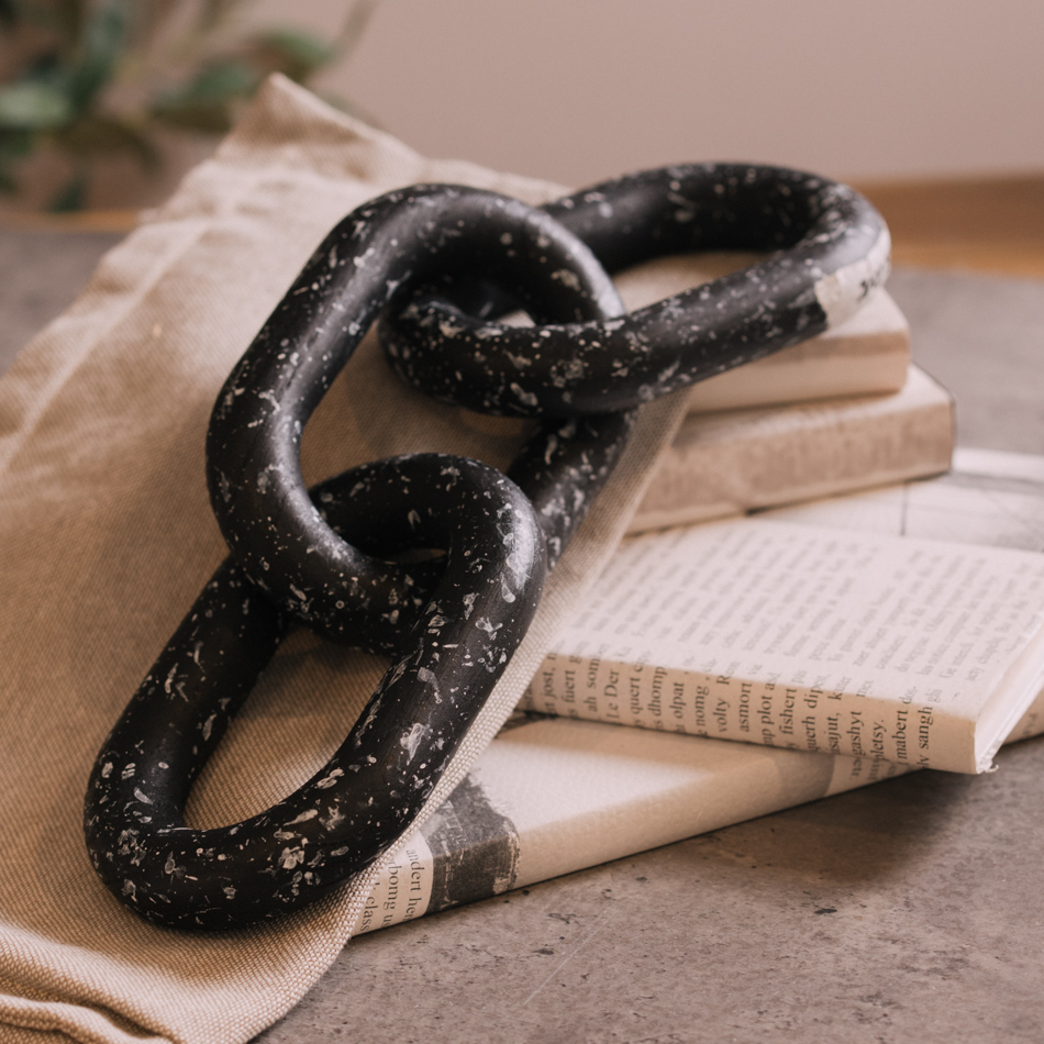 Adorno decorativo Gerzat en madera negra 10,5 x 37 cm. De diseño contemporáneo y líneas orgánicas, este adorno se destaca por su forma entrelazada que aporta movimiento y sofisticación. Su acabado en negro con textura salpicada genera un contraste sutil, ideal para sumar carácter sin perder elegancia. Perfecto para mesas, bibliotecas o consolas, donde funciona como pieza escultórica y punto focal.