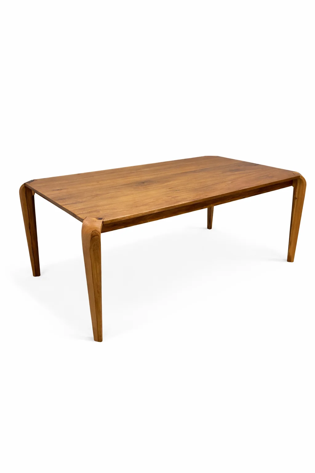 Líneas limpias y proporciones equilibradas definen esta mesa, pensada para espacios que priorizan estética y funcionalidad. Su tapa amplia resalta la riqueza natural de la madera, con vetas únicas que aportan carácter y calidez. Las patas curvas integradas generan una silueta fluida y elegante, logrando una pieza distintiva sin perder ligereza visual. Su estructura firme y diseño atemporal la convierten en el centro ideal para comedores modernos o ambientes integrados.
