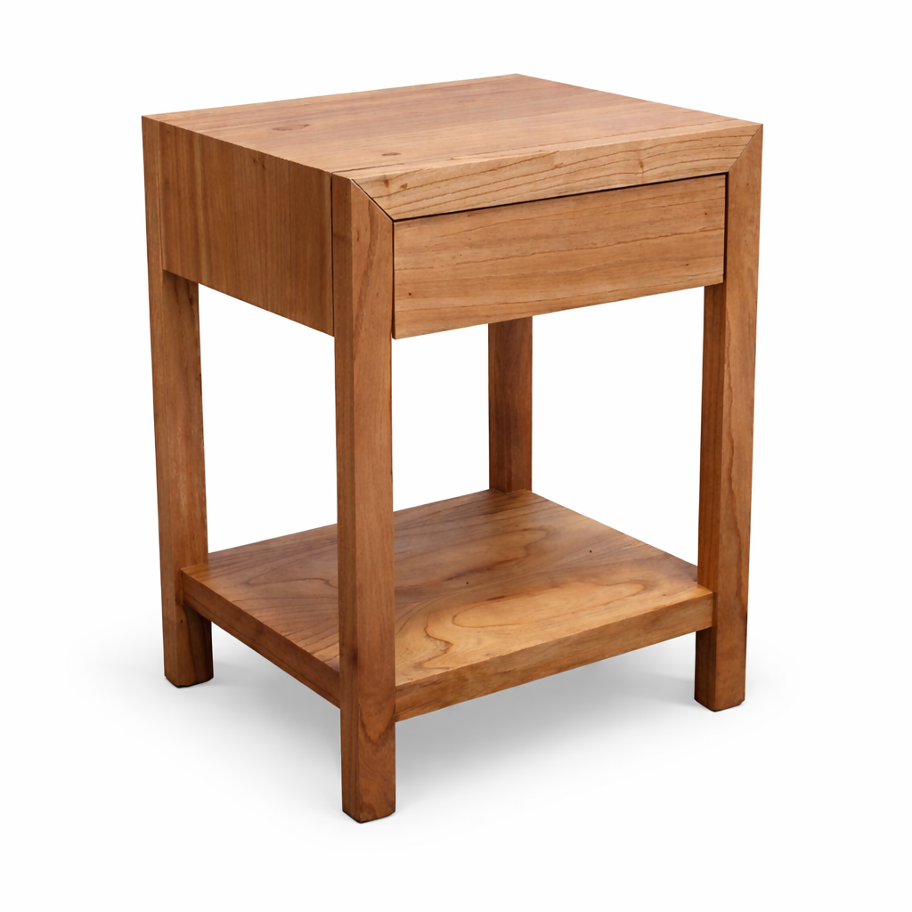 Mesa de luz de diseño moderno y líneas simples. Con cajón de guardado. Disponible en distintas maderas y terminaciones. Madera: Guatambú, Paraíso, Petiribí.