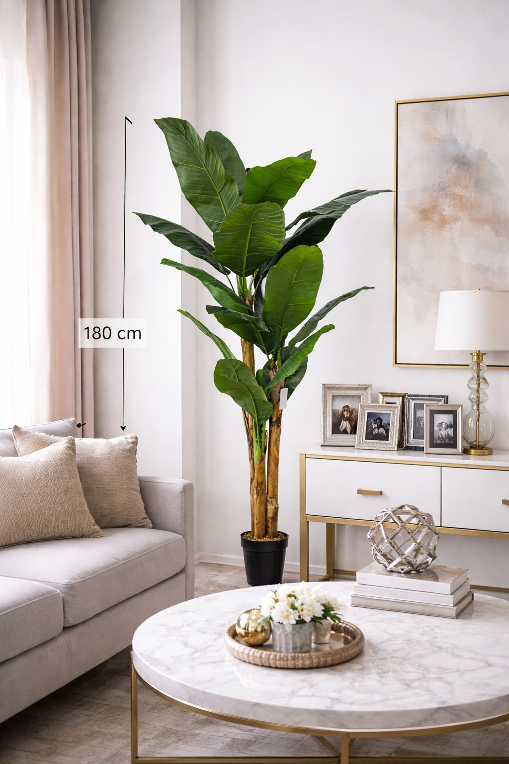 Planta decorativa artificial 180 cm. De gran presencia y estilo tropical, esta planta se destaca por sus hojas amplias y verticales que aportan frescura y movimiento al ambiente. Su altura la convierte en una pieza protagonista, ideal para vestir espacios amplios con un toque natural. Perfecta para livings, locales o rincones que buscan sumar impacto visual sin mantenimiento.